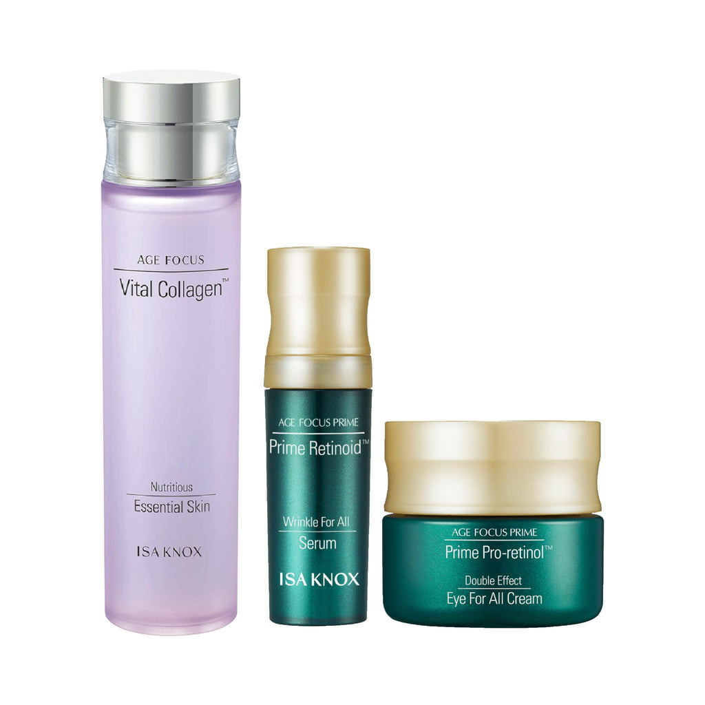 ISA KNOX AGE FOCUS VITAL COLLAGEN Emulsion, PRIME Wrinkle For All Serum & PRIME Eye For All Cream (177 ml/5.99 fl oz) - Korean Skin Care by LG Beauty. Vitamins C, B12 & E.