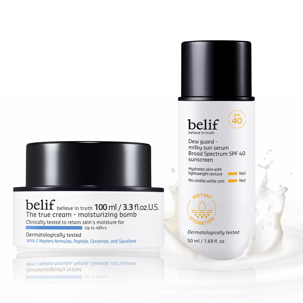belif Ceramide & Sun Serum Duo Moisturizing Bomb 100ml + Milky Sun Serum SPF 40 | 48hr Hydration, Barrier Repair, Lightweight UV Defense, Korean Skincare Set