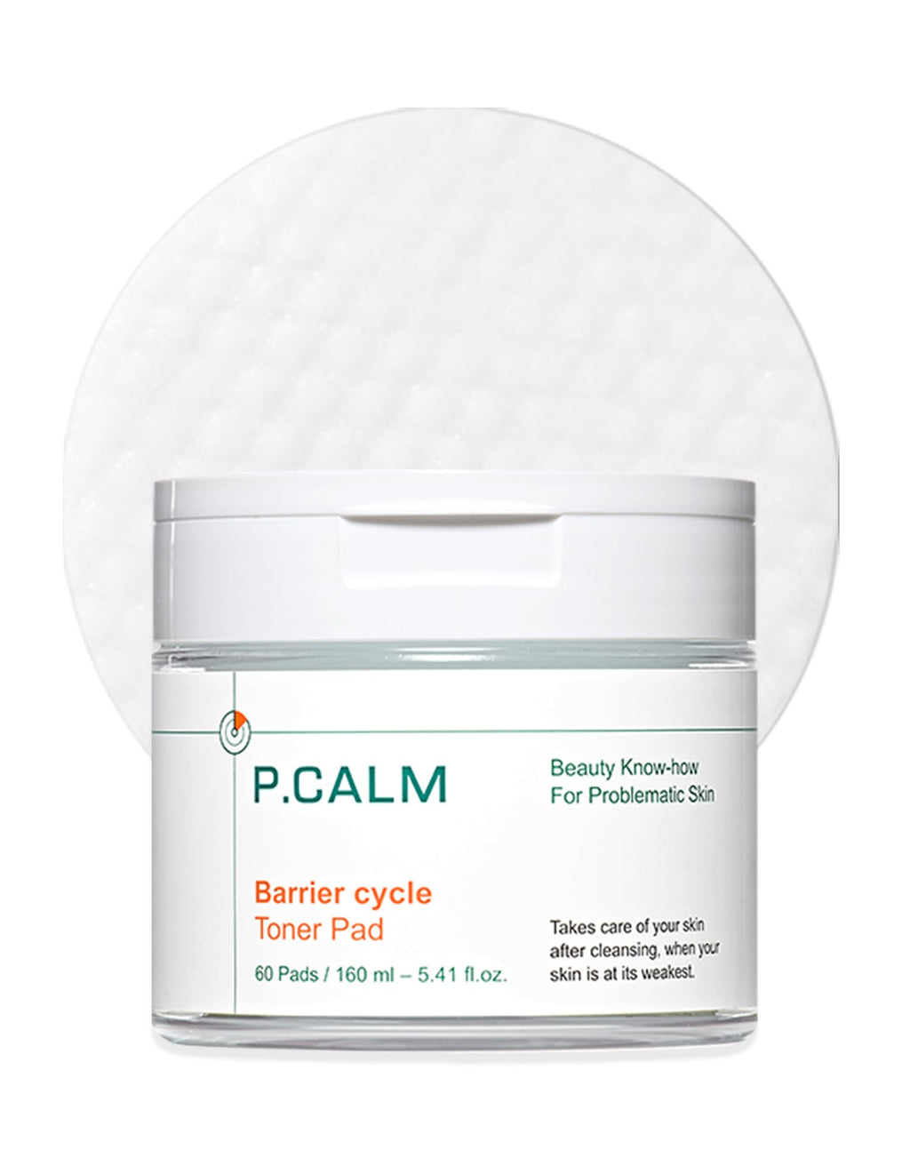 P.CALM Barrier Cycle Toner Pad 60 Pads with Centella Asiatica & Papaya Extract for Soothing, Moisturizing & Exfoliating, Korean Vegan Facial Toners Pads for Sensitive Skin (160ml / 5.41 fl.oz)