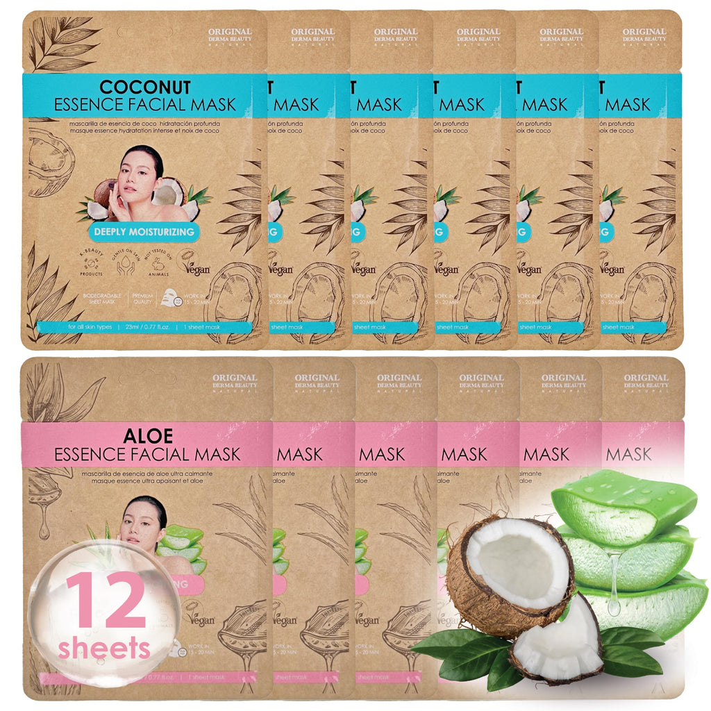 12PK (6+6) Vegan Face Masks for Skincare - Coconut, Aloe, Vitamin, Cucumber Facial Sheet Mask Korean Skin Care (Coconut & Aloe)